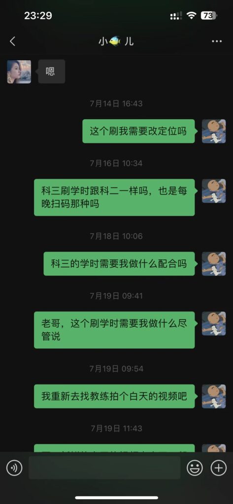 这里我曾经一度想过放弃学车了,非常浪费时间,每天都是过得非常痛苦,快魔怔了。 最后给余老板不停地电话告状(估计对方也被我给整麻了,开始在电话里称呼我“习总”),才最终把科三的学时刷完了