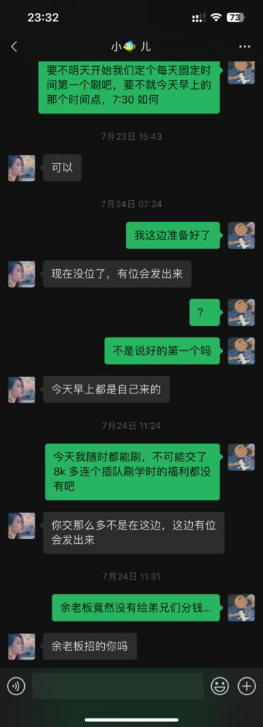 估计是余老板他自己也觉得理亏,最后承诺说周末亲自带我练车,我也不想扯太深就答应了,但是后面跟他的沟通也是奇怪: