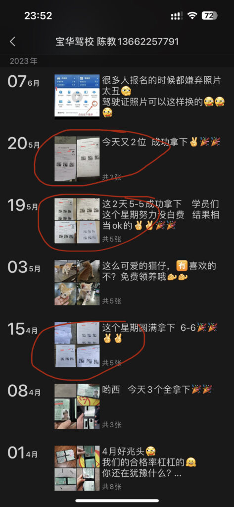 突破口在陈教练身上,翻了翻陈教练的朋友圈,发现他经常发学员通过科三考试的成绩单照片,虽然他也打码了,但是这个码吧,他打了好像又没打,右上角的条码就是学员的身份证号(条码下面就是完整的身份证号码,下面图二就是他打码的原图):