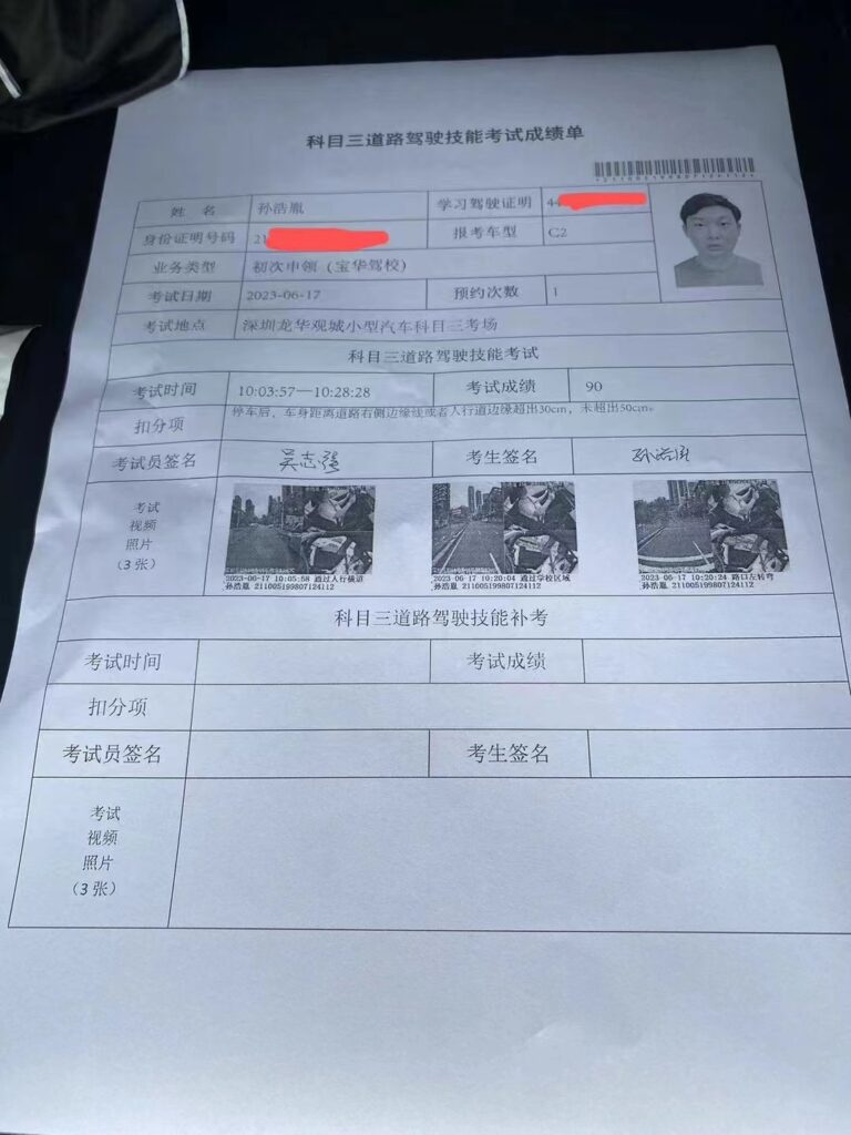 练科三的时候老婆提醒我要不要给点红包啊,后来我想 8k 都花出去了,也不在乎这点红包钱了,于是给科三教练总共发了 200 的红包。 科三考试虽然预约到了据说是深圳最难的辅城坳考场,但是我准备比较充分,考试一把过了 科三结束就直接考了科四,也是一把过,然后门口等了不到半小时拿到证了。